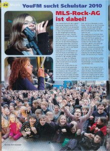 Am 23.11.2010 gab die MLS Rock-AG im Rahmen der YOUFM-Schulstar-Aktion ein tolles Konzert auf dem Schulhof der MLS. Zwar reichte es beim Voting nicht zum Wochensieg aber immerhin kam man aufs Treppchen: Platz 3 für die MLS. Im Grunde aber hat die ganze Schule gewonnen: eine tolle Veranstaltung, bei der alle Schüler auf den Beinen waren.
