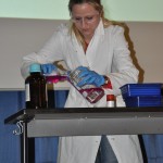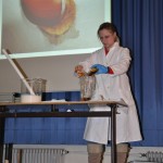 Unter dieser Fragestellung stand ein spannender Experimentalvortrag von Frau Prof. Seema Agarwar (Leiterin Macromolecular Chemistry, Fb. Chemie, Univ. Marburg). Unterstützt wurde sie von ihrer Assistentin Laura Hamel (Dipl. Chemieingenieurin). Im Programm hatten die Wissenschaftlerinnen nicht nur einen Einblick in die Frage, wie man Chemikerin wird oder den Fachbereich Chemie der Universität Marburg, sondern auch jede Menge faszinierend Experimente. Dabei gelang es Prof. Agarwal immer wieder, das Publikum praktisch mit einzubeziehen. In den vielfältigen Experimenten wurden u.a. Flummis und Nylon hergestellt sowie Elefantenzahnpasta und grüner Schleim erzeugt. Gekommen waren Schülerinnen der Jgs. 5-12, Eltern und Kolleginnen der MLS.