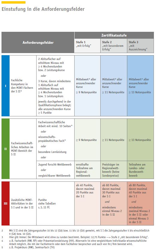 Schülerinnen und Schüler, die das MINT-Zertifikat erhalten wollen, müssen Mindestanforderungen in den drei Anforderungsfeldern: fachliche Kompetenz, fachwissenschaftliche Kompetenz und zusätzliche MINT-Aktivitäten erfüllen.