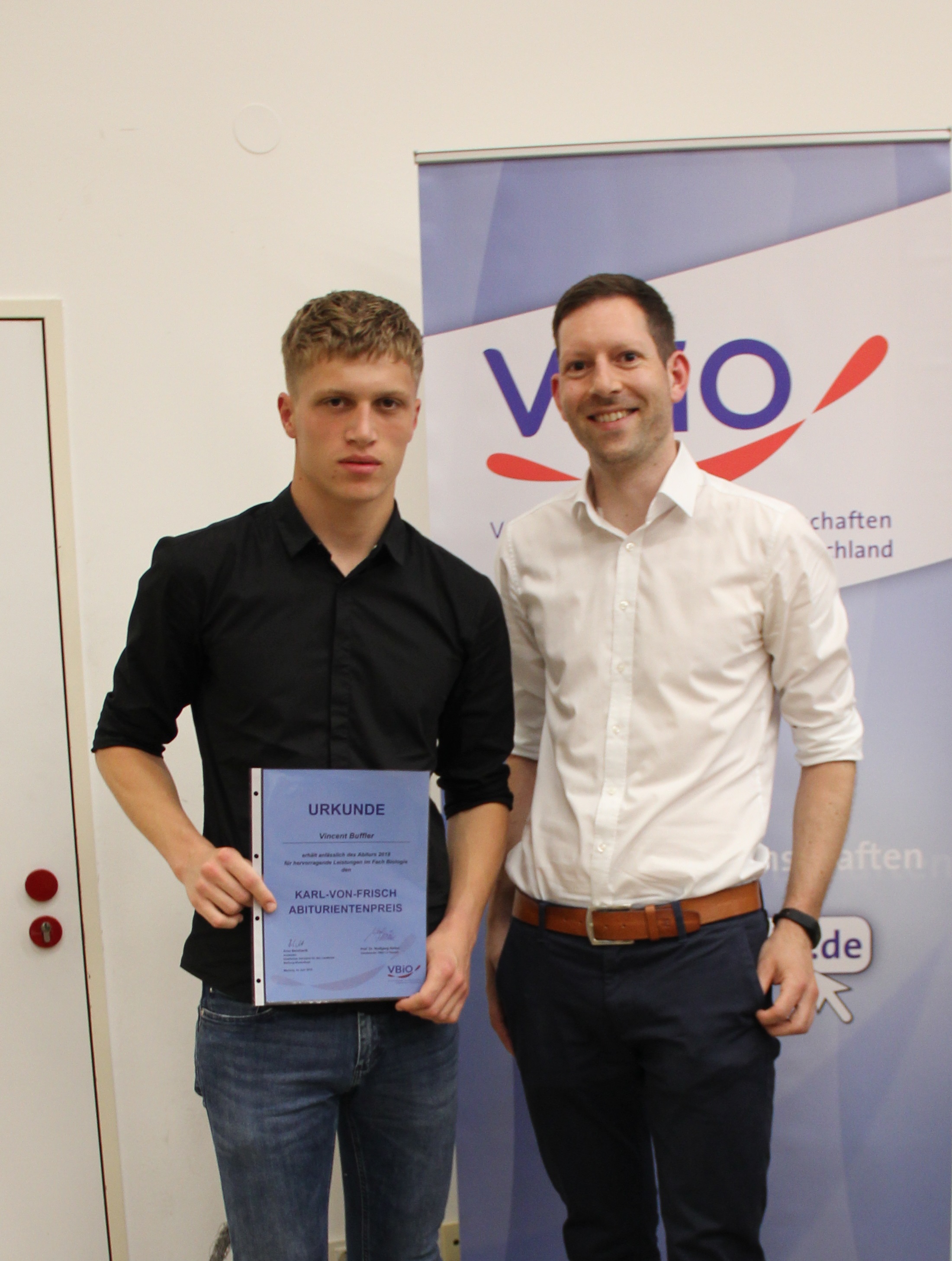Am 9. Juni wurde Vincent Buffler (Q4) der Karl-von-Frisch-Preis am Fachbereich Biologie der Universität Marburg verliehen. Diese Auszeichnung erhalten hessenweit Schülerinnen und Schüler, die hervorragende Leistungen im Fach Biologie während der gesamten Qualifikationsphase der Oberstufe und in der schriftlichen Abiturprüfung erreichen konnten. Neben der Preisverleihung wurden mehrere Fachvorträge gehalten, die jungen Biologinnen und Biologen Arbeits- und Forschungsfelder der Zukunft aufzeigen konnten. In Führungen konnten die kommenden Studentinnen und Studenten ins Uni-Leben reinschnuppern.