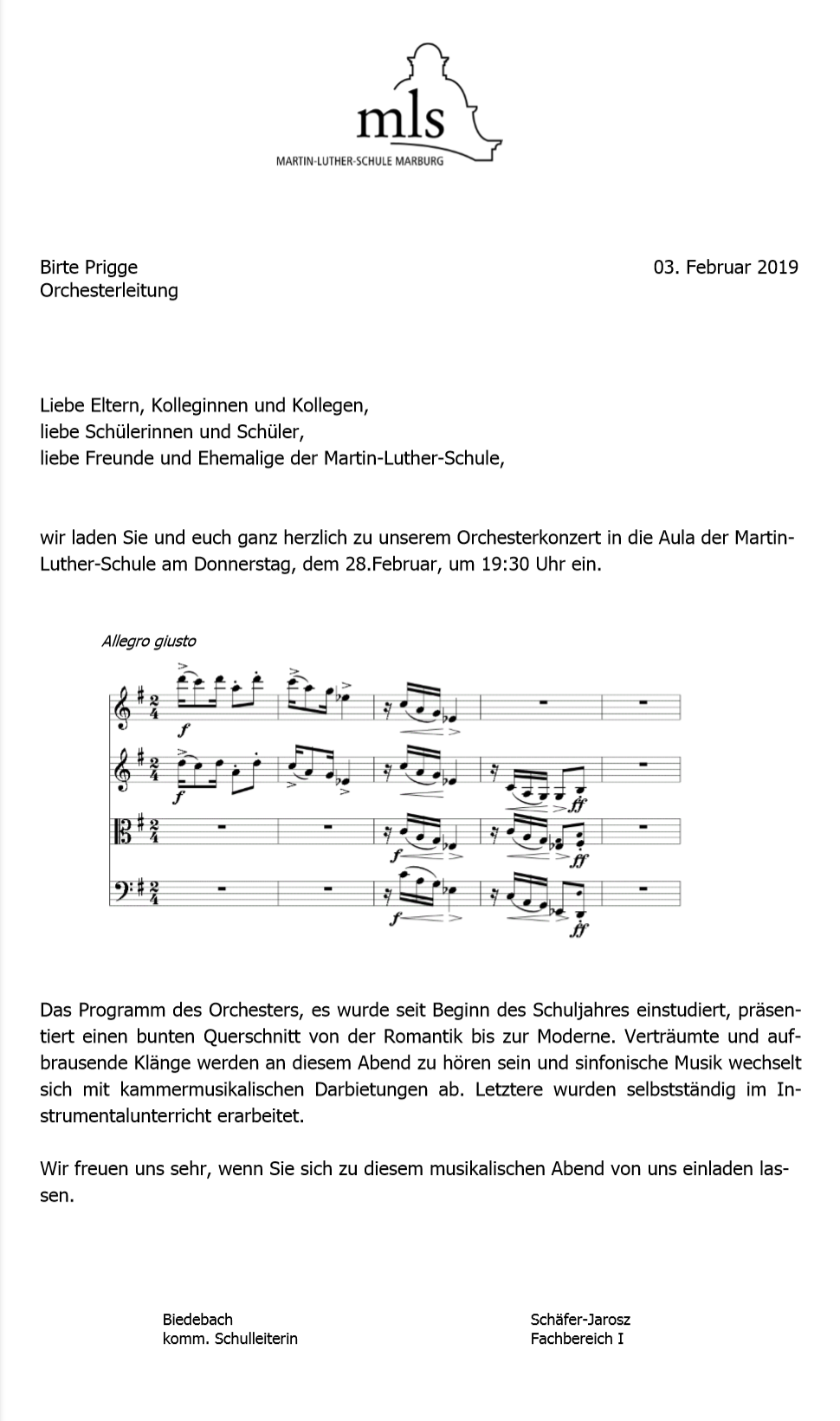 Wichtiger Hinweis: Dies wird das letzte Orchesterkonzert unter der Leitung von Frau Prigge sein!
