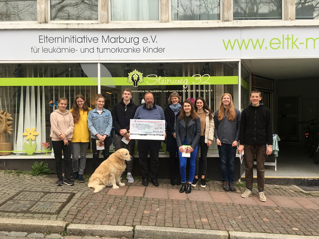 Im Vorfeld hatte sich der Französischkurs dafür entschieden, den Erlös seiner Aktion der „Elterninitiative Marburg e.V. für leukämie- und tumorkranke Kinder“ zukommen zu lassen, einem Verein, der sich ausschließlich durch Spenden finanziert. Das Engagement der Schülerinnen und Schülererbrachte stolze 520 Euro, die Sie Herrn Karl Kreh, einem der hauptamtlichen Mitarbeiter im Stützpunkt des Vereins am Steinweg 32 überreichen konnten. Dabei erfuhren sie im persönlichen Gespräch mit Herrn Kreh viel über die wichtige und beeindruckende Arbeit des Vereins in der Begleitung und Betreuung der erkrankten Kinder und ihrer Familienangehörigen. Um so mehr freuten sie sich, mit ihrer Spende den Familien und Kindern helfen zu können.