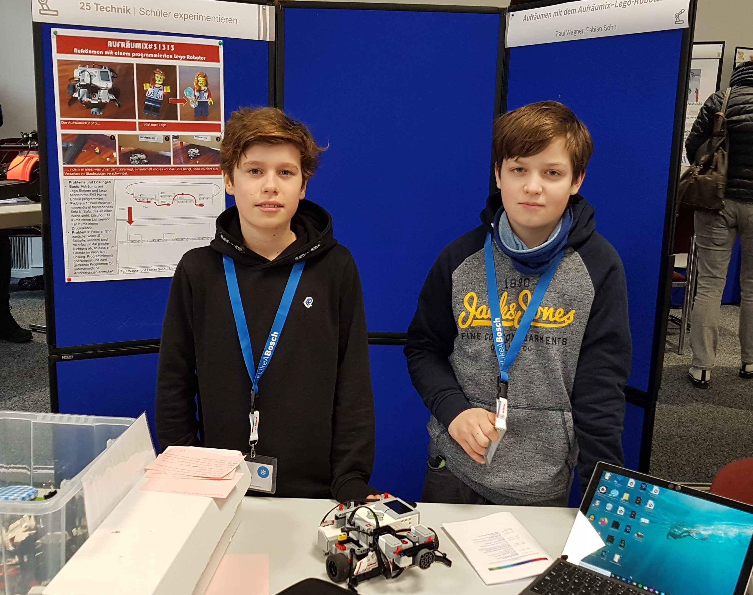 Am Freitag, den 21.02.20 fand im Bosch-Werk in Lollar der Regionalwettbewerb von Jugend Forscht bzw. Schüler Experimentieren statt. Die MLS-Schüler Fabian Sohn und Paul Wagner aus der Klasse 6c haben im Bereich Technik teilgenommen und mit ihrem Lego-Mindstorms-Roboter Aufräumix#31313 die Jury überzeugen können. Sie erreichten einen tollen zweiten Platz. Dieser wurde gestiftet vom Verein Deutscher Ingenieure e.V. Zusätzlich gewannen sie den Sonderpreis „Make“. Betreut wurde das Projekt von Michael Szabo und Markus Schmidt.
