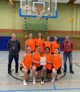 von links: David Irnich (Teamcoach); Marlene Rasch; Hannah Adaszewska; Greta Katebini; Jana Mann; Steffen Gläser (Schulsportleiter MLS); Hannah Greinke; Frieda Allmeroth; Jana Hassan; Maaret Franz