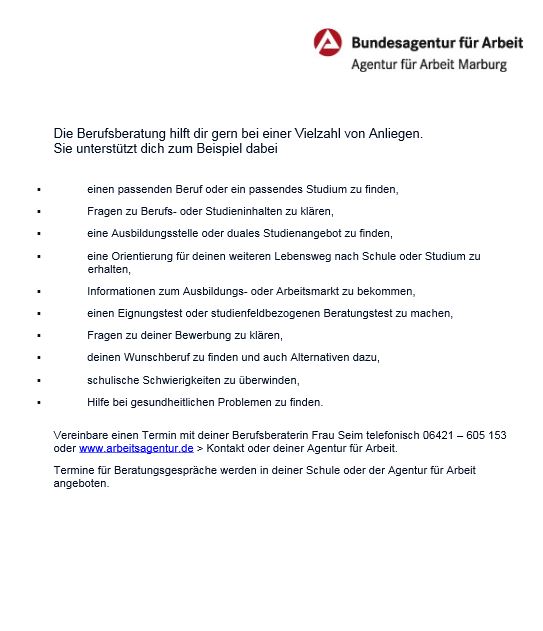 Frau Seim kann auch telefonisch oder per E-Mail erreicht werden unter 06421/605153 bzw. Marburg-Berufsberatung@arbeitsagentur.de