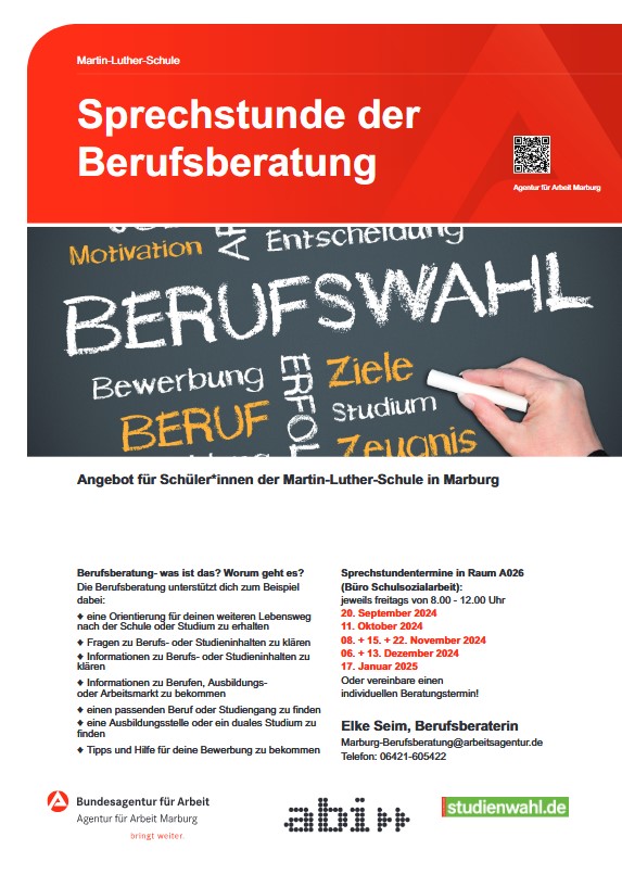 Frau Seim von der Arbeitsagentur bietet für die Schüler neben allgemeinen Terminen auch persönliche Sprechstunden zur Berufsberatung an: